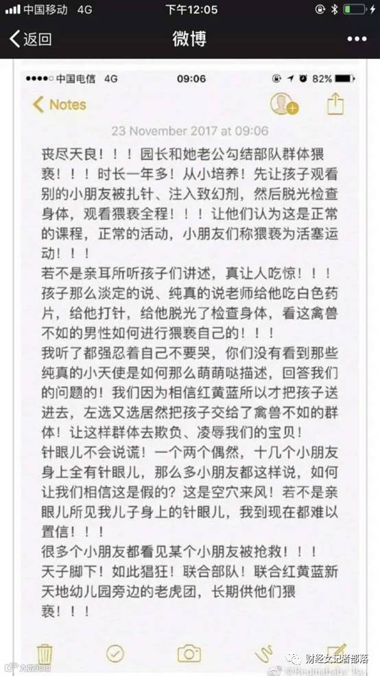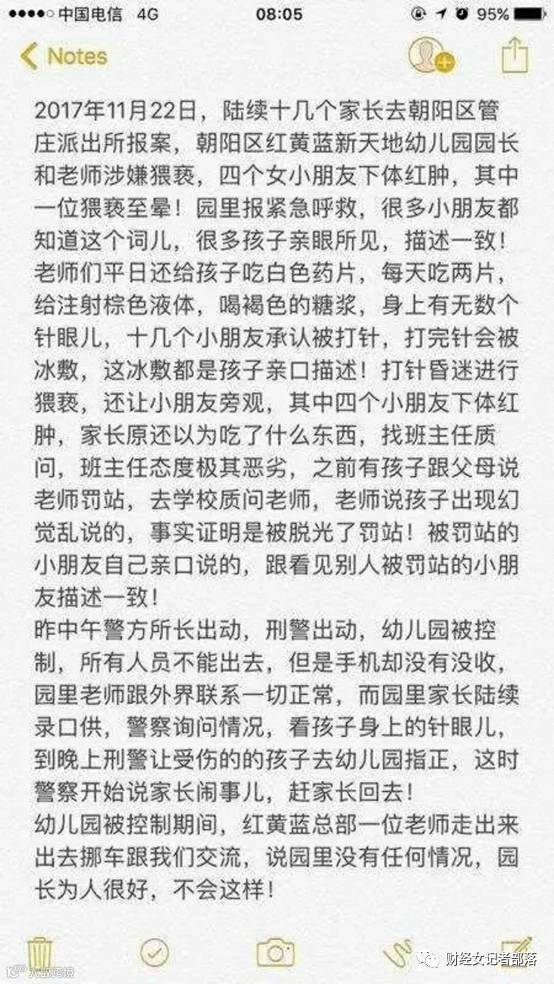 小财女实在是无法想象和平年代这种惨无人道的事情竟然会发生,以下是网上流传的部分红黄蓝受害家长的总结的泣血文书: