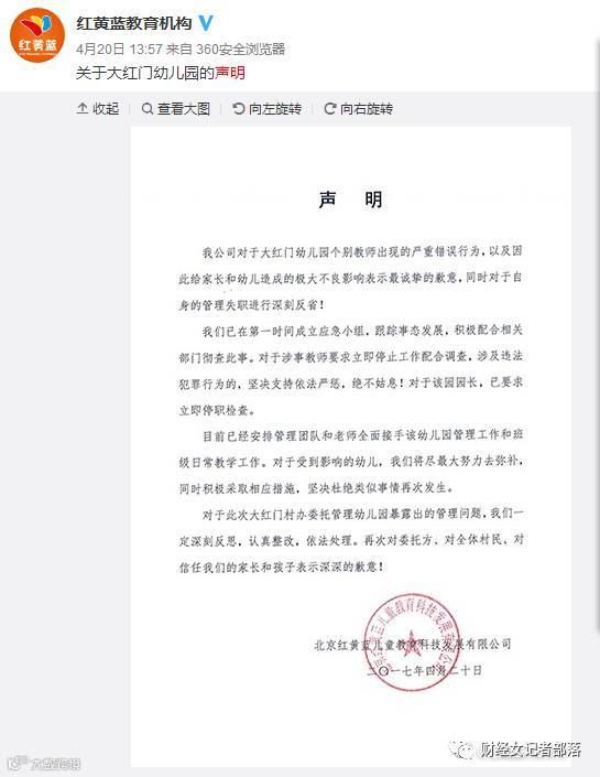 不仅如此,小财女还看到了当初红黄蓝(大前门)因个别教师出现的错误行为而发布的声明:
