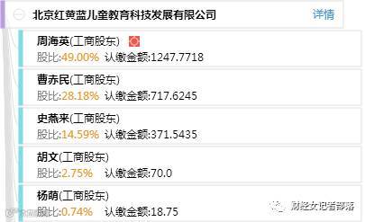 据天眼查资料显示,红黄蓝于2001年注册,注册资本2546万元,法人代表史燕来,持股比例14.59%。周海英和曹赤民分别是公司的前两大股东,分别持股49%和28%。