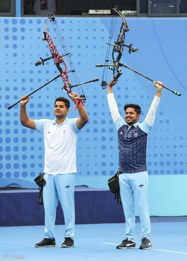 ▲10月7日,在杭州亚运会射箭项目男子复合弓个人赛中,印度选手奥贾斯·普拉温·德奥塔莱(右)获得冠军。新华社记者 单宇琦 摄