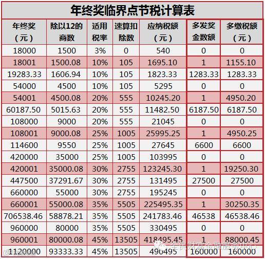 卡准临界点可是件很重要的事情哦!有时候你年终奖多得了一块,但结果被扣的税反而多了1000+,甚至更多,可不要被那1块给欺骗了,找准临界点才能让我们拿到最高的年终奖!