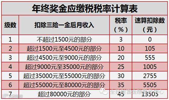以下内容和表格关于年终奖纳税额的计算均以个人取得年终奖当月的工薪所得是高于或等于3500元为前提。