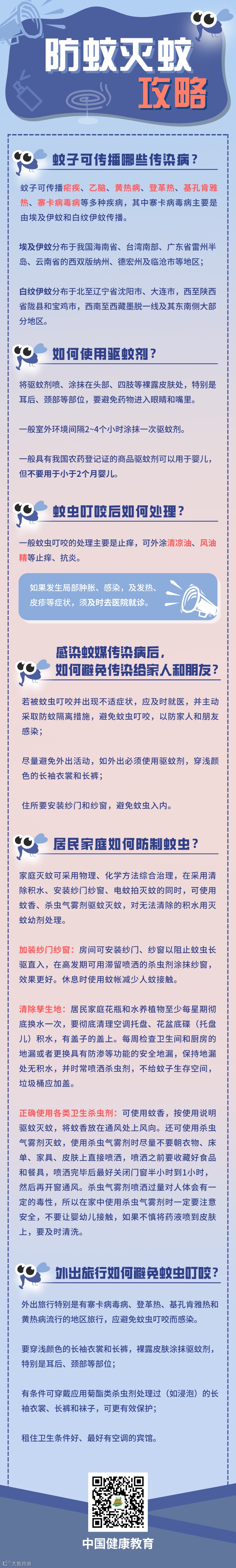 雷雨天气,未及时清除的积水容易成为蚊子孳生地。近日广州市爱国卫生运动委员会发布防蚊灭蚊宣传知识要点,一图教你如何防蚊灭蚊!