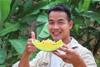3月15日,在育才生态区那受村,一名游客在品尝完彩虹西瓜后,赞不绝口。