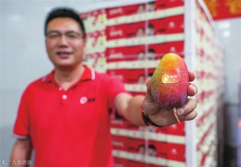 3月13日,在三亚福返芒果(总部),彭时顿向镜头展示“福返”牌芒果。