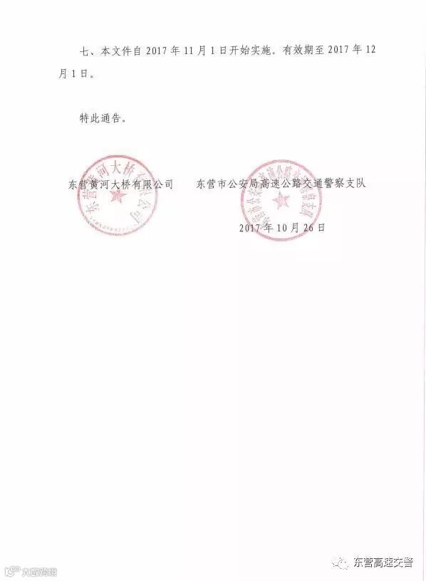G18荣乌高速公路东营黄河大桥自2017年11月1日至12月1日实施伸缩缝维护作业,单向1/4幅封闭,单向单车道通行,双向同时施工,为确保施工管制期间道路畅通,保护人民群众生命财产安全,根据施工顶升工艺对承载能力的要求和专家评审意见,依据《中华人民共和国道路交通安全法》等规定,东营市公安局高速公路交通警察支队在报请上级机关批准后,决定自2017年11月1日起,对局部路段通行车辆实施限行交通管制措施,现通告如下:
