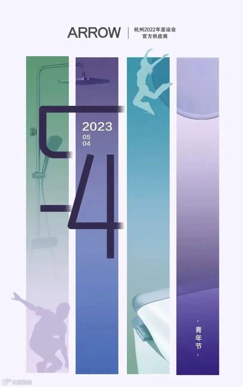 箭牌卫浴作为2022年杭州亚运会官方供应商在五四青年节设计了一份海报,海报上既有品牌产品又有一男一女两位起跳的剪影,宣传语为“心存热爱,永远向前”。
