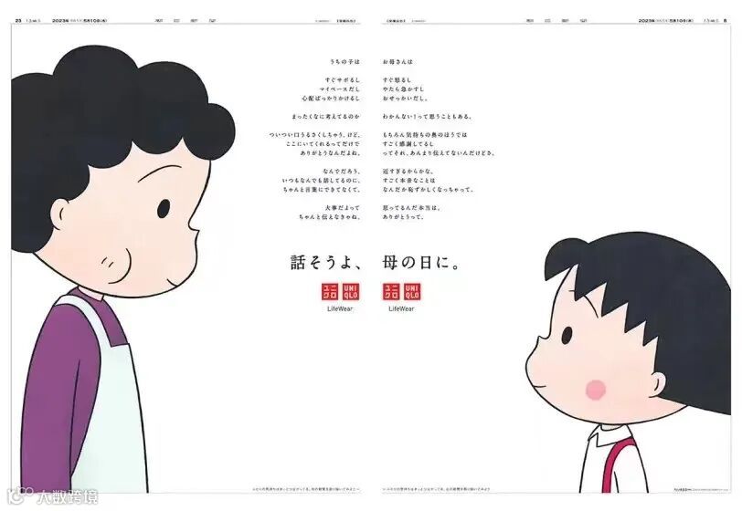 日本优衣库联合《朝日新闻》,在母亲节当天的《朝日新闻》中,分别在第6页和第23页刊出了小丸子和妈妈的独白。这两页的距离看似遥远,但只要读者把夹在其中的报纸拿掉,就会发现,其实两人的页面是连在一起的。有种两者在对话的感觉。
