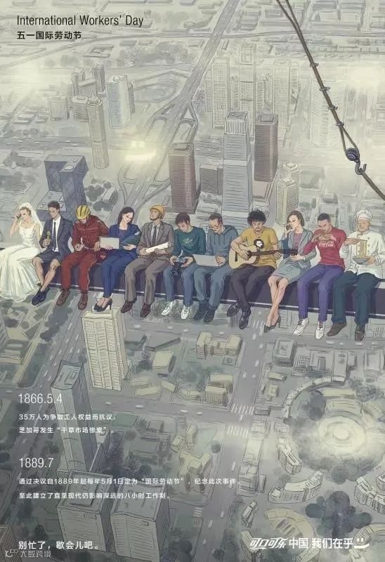 可口可乐宣传语“别忙了,歇会儿吧”,海报中间是一群各式各样职业正在工作的人,坐在城市上方,呼吁“劳动节不劳动”。