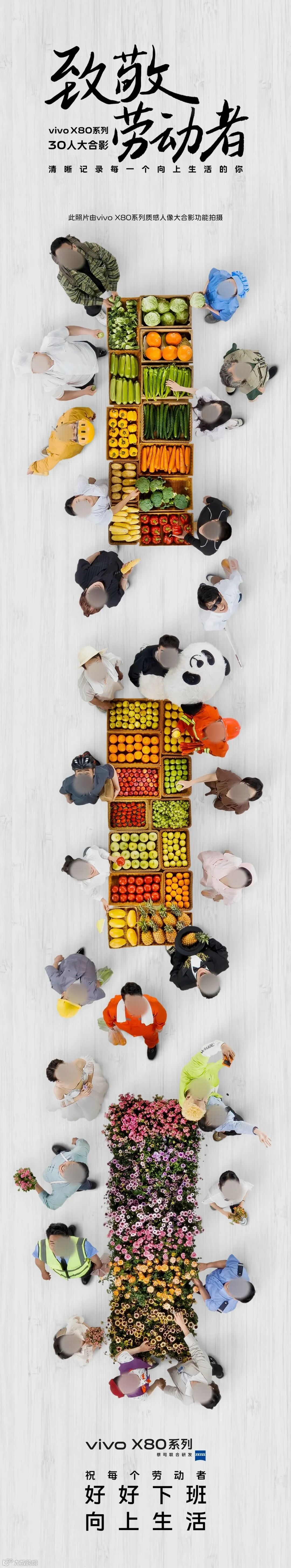 vivo以”致敬劳动者,你向上生活的样子真美!“为宣传语用其品牌手机拍摄了一张各类劳动者一起抬头看的照片,寓意为在这个属于劳动者的节日,记录下了30位劳动者向上生活的模样。从从忙碌的工作中抬起头, 感受春天的空气, 好好享受生活吧!