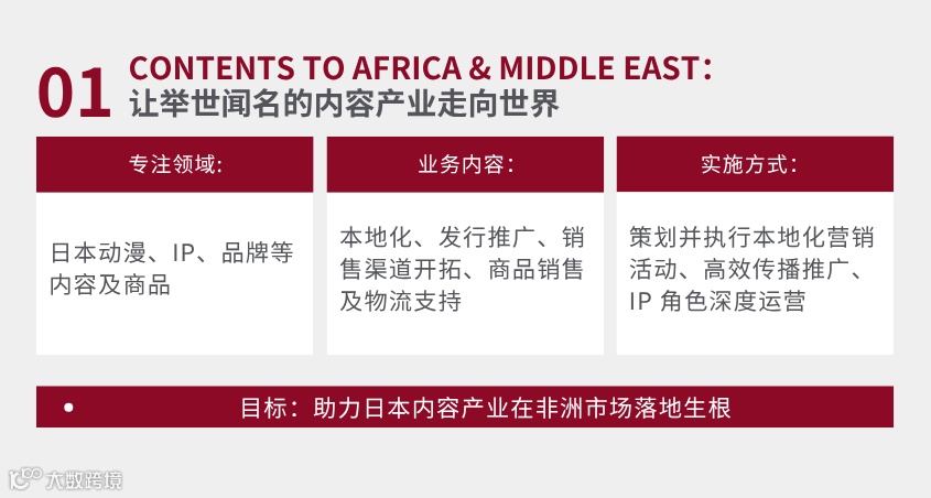 专注于日本动漫、IP、品牌等内容及商品的本地化、发行推广、销售渠道开拓、商品销售及物流支持。通过策划并执行本地化营销活动、高效传播推广以及IP角色深度运营,助力日本内容产业在非洲市场落地生根。
