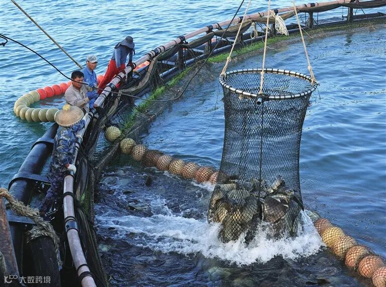 ▲在西岛深海网箱养殖区,工人正在吊起渔获。