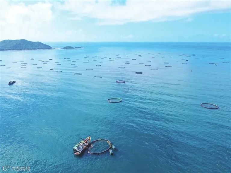 ▲在西岛海域的深海网箱养殖区