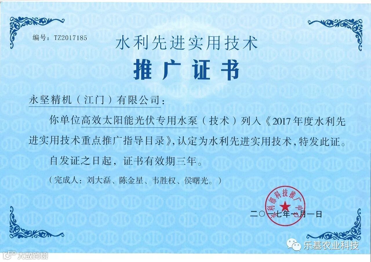 永坚太阳能光伏专用水泵(技术)被国家水利部科技推广中心认定为水利先进实用技术,并列入《2014、2015、2016、2017年度水利先进实用技术重点推广指导目录》,《2015、2016、2017全国水利系统优秀产品招标重点推荐目录。