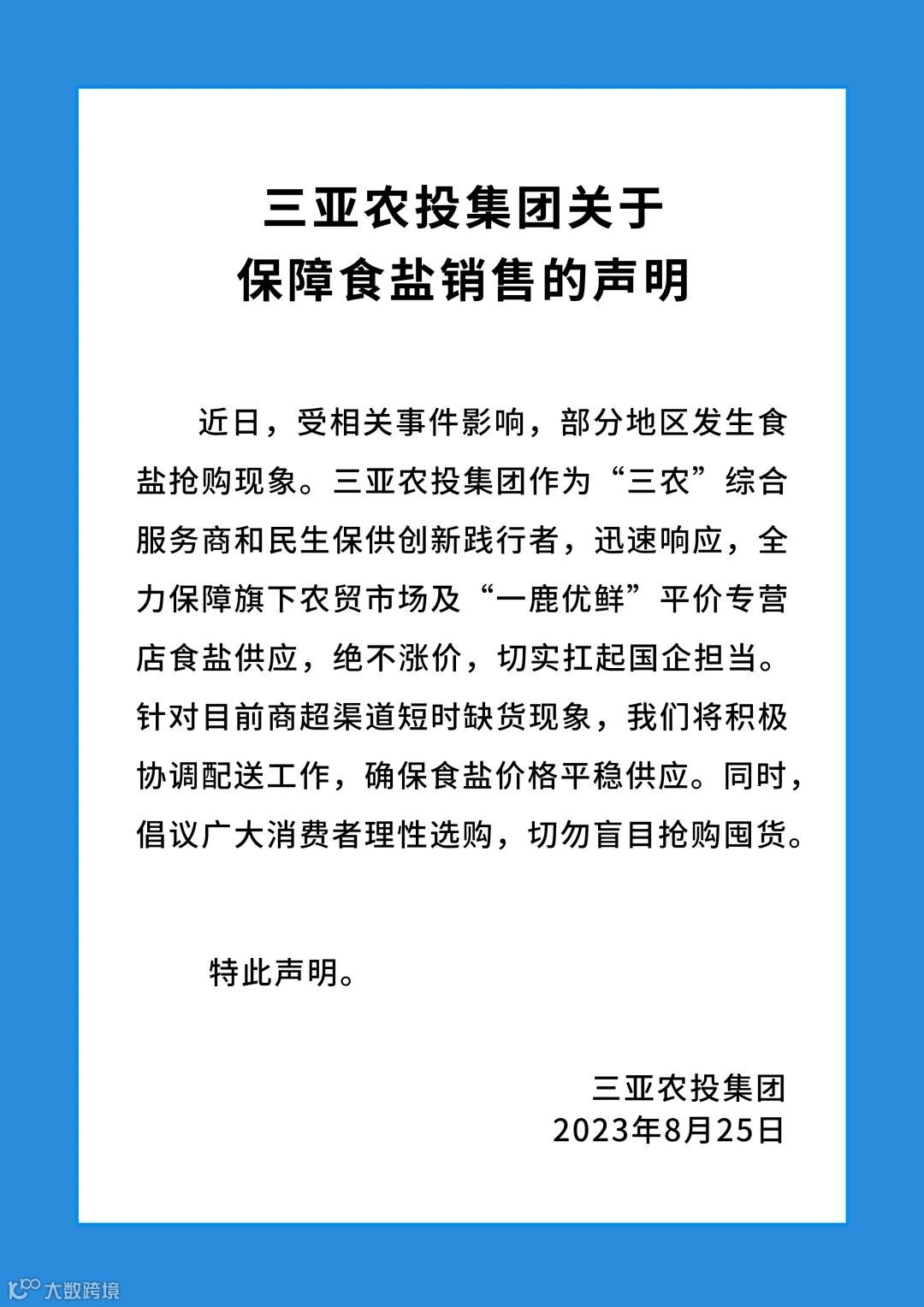 近日,我市个别地方出现抢购食用盐的现象。目前我市食用盐储备量十分充足,三亚生命之花盐业公司食盐总储备量近200吨,后续还会持续调运。大家无需抢购,无需恐慌,请广大市民不信谣、不传谣,按需求理性购买。为保障食用盐价格秩序平稳,维护人民群众合法权益,现提醒告知如下: