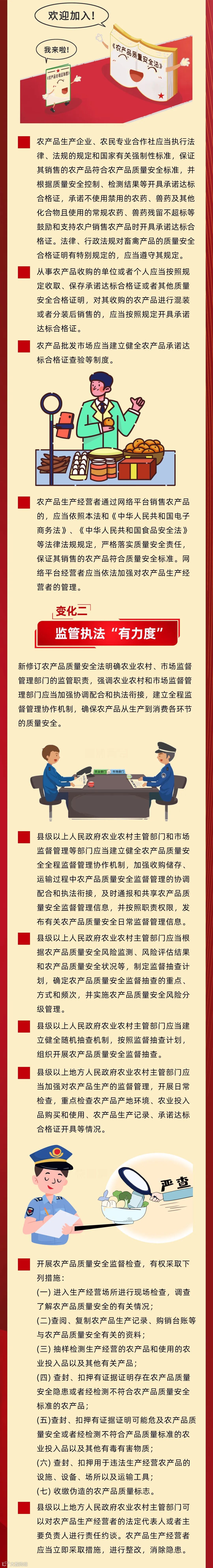 2022年9月2日,《中华人民共和国农产品质量安全法》修订通过,予以公布,于2023年1月1日起施行。此次修订农产品质量安全法,坚持全面体现最严谨的标准、最严格的监管、最严厉的处罚和最严肃的问责“四个最严”要求,从生产环节到加工、消费环节,做好与食品安全法的衔接,实现农产品从田间地头到百姓餐桌的全过程监管。