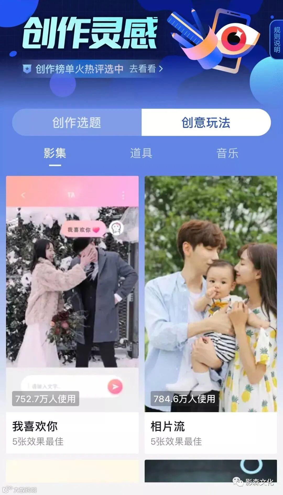 除了选题之外,你可以点击“创意玩法”,查看影集、道具、音乐等当前热门的视频创意方式,选择适合自己的进行使用即可,这些创意方式,不仅能让你的视频内容更加有趣多变,还能获得官方对应的流量扶持哦!