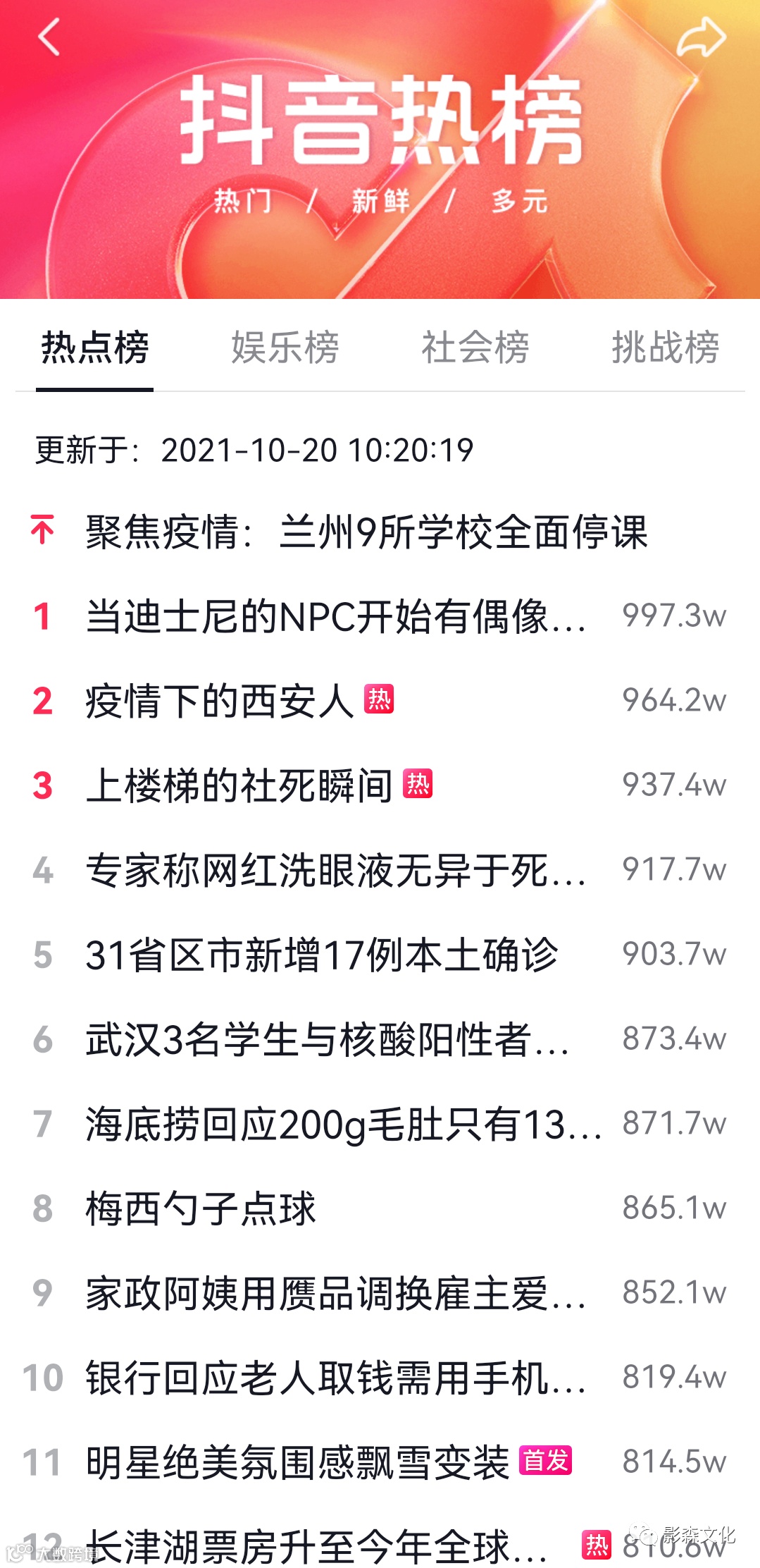 搜索“抖音热榜”,结合热点榜单的信息进行视频的创作,除了热榜,还有娱乐榜、社会榜、挑战榜、同城榜等,可以根据自己账号的定位和类型进行借鉴创作。