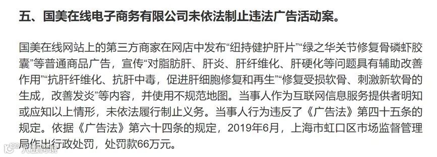 2019年12月12日,国美在线网站上的第三方商家在网店中发布宣传有治疗功效的普通食品违法广告,国美在线未依法履行制止义务,被罚款66万元。