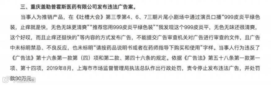 2019年12月17日,999皮炎平因在《吐槽大会》第三季第4、6、7三期片尾小剧场中通过演员口播广告,但未标明禁忌、不良反应,也未标明“请按药品说明书或者在药师指导下购买和使用”字样,被罚款90万元。