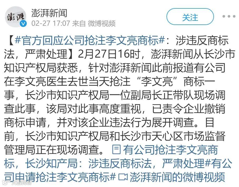 2月27日,长沙市知识产权局责令企业撤销申请,并且已经对该违法行为展开调查。