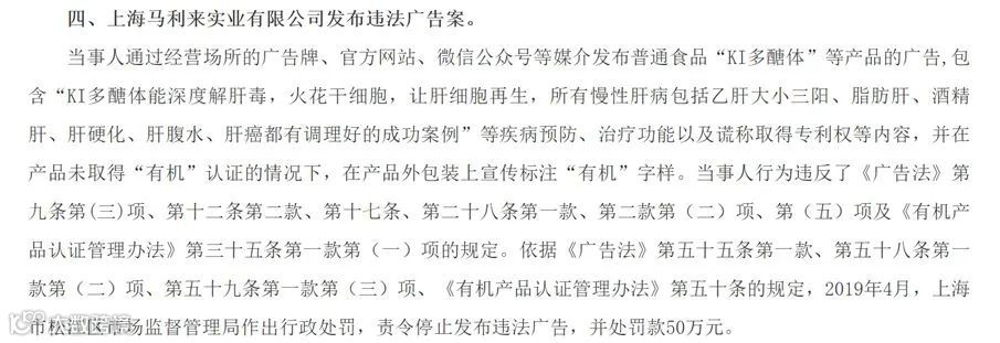 2019年12月,上海马利来实业有限公司因虚假宣传普通食品“KI多醣体”具有疾病预防、治疗功能的广告,被罚款50万元。