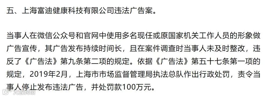 2019年,上海富迪健康科技有限公司因使用多名国家机关工作人员的形象做广告宣传,被罚款100万元。