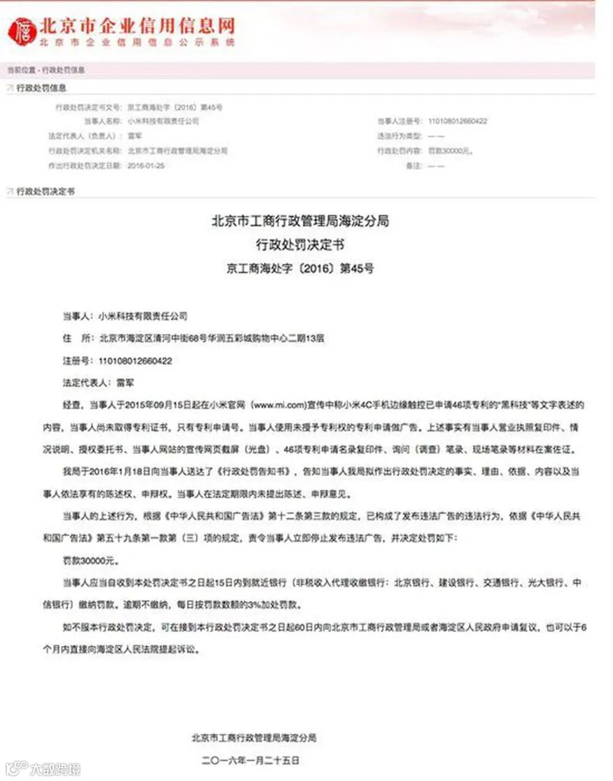 2016年1月25日,小米公司在官网出现“小米4C手机边缘触控已申请46项专利的”文字宣传,但其实专利没拿到,被处以3万元罚款。