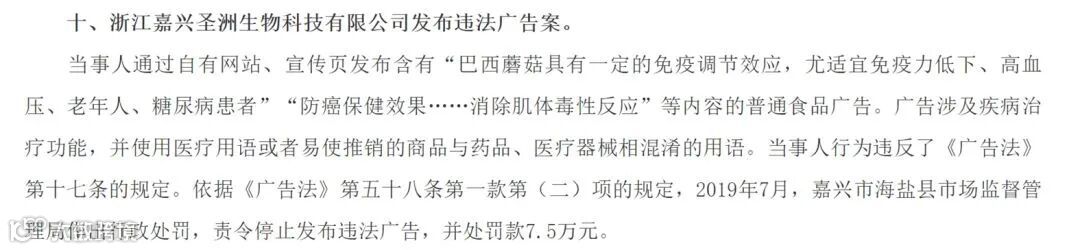 2019年,浙江嘉兴圣洲生物科技有限公司因发布涉及疾病治疗功能、使用医疗用语的普通食品广告“巴西蘑菇”,被罚款7.5万元。