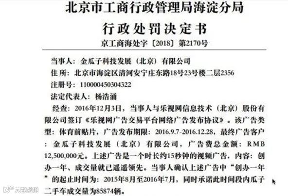 2018年11月15日,金瓜子科技发展(北京)有限公司因在广告中使用瓜子二手车“创办一年、成交量就已遥遥领先”的不实宣传语,被罚款1250万元。