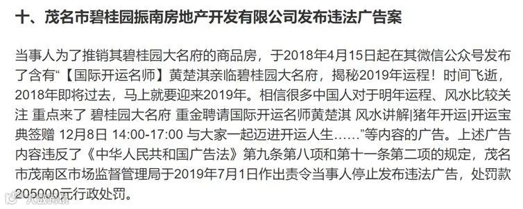 2019年,茂名市碧桂园发布“重金聘请国际开运名师黄楚淇风水讲解、猪年开运、开运宝典签赠”的广告,因涉及迷信内容被罚20.5万元。