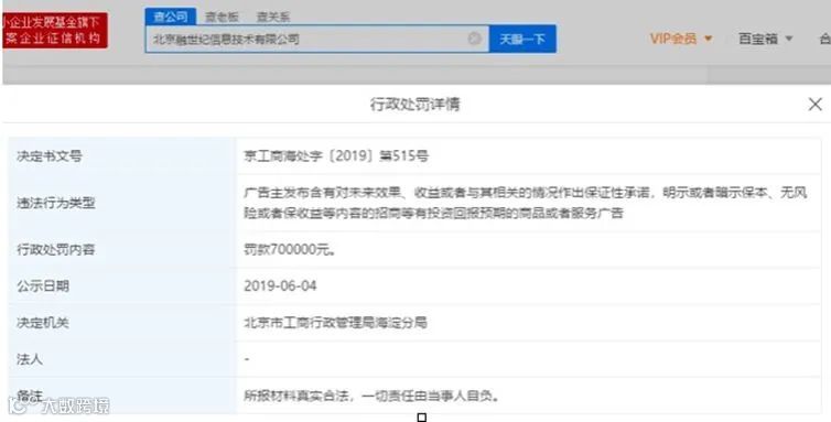 2019年6月4日,互联网金融垂直搜索平台融360母公司北京融世纪信息技术有限公司因含有“对未来收益进行保证性承诺”被罚款70万元。