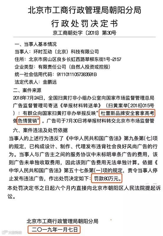 2018年7月24日,环时互动因为杜蕾斯品牌做高考软色情营销,被罚款80万元。