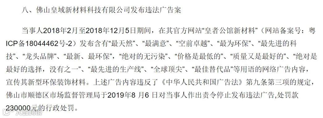 2019年,佛山皇域新材料科技有限公司发布含有 “龙头品牌”、“绝对的无污染”、“价格是最低的”、“质量又是最好的”、“绝对是最好的选择,没有之一”、“全球顶尖”、“最佳替代品”等用语的广告,被罚款23万元。