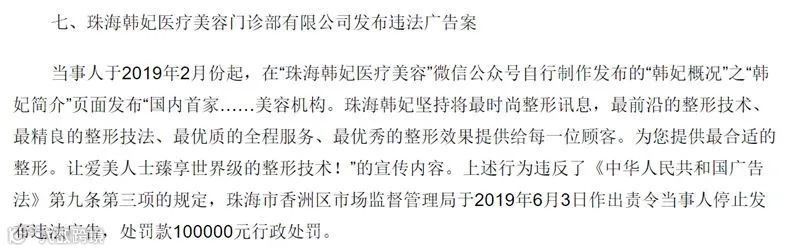2019年,珠海韩妃医疗美容门诊部有限公司发布包含“国内首家”、“最前沿的整形技术、最精良的整形技法、最优秀的整形效果”、“世界级的整形技术”的宣传内容,被罚款10万元。