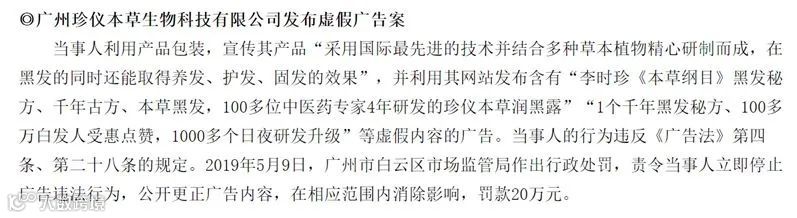 2019年,广州珍仪本草生物科技有限公司发布含有“千年古方”、“黑发秘方”“让你一生拥有永久黑头发”等内容的虚假内容广告,被罚款20万元。