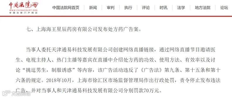 2018年6月15日,上海海王星辰药房有限公司因开展“有球必硬夜夜激情”网络直播活动,被依法处罚款70万元。
