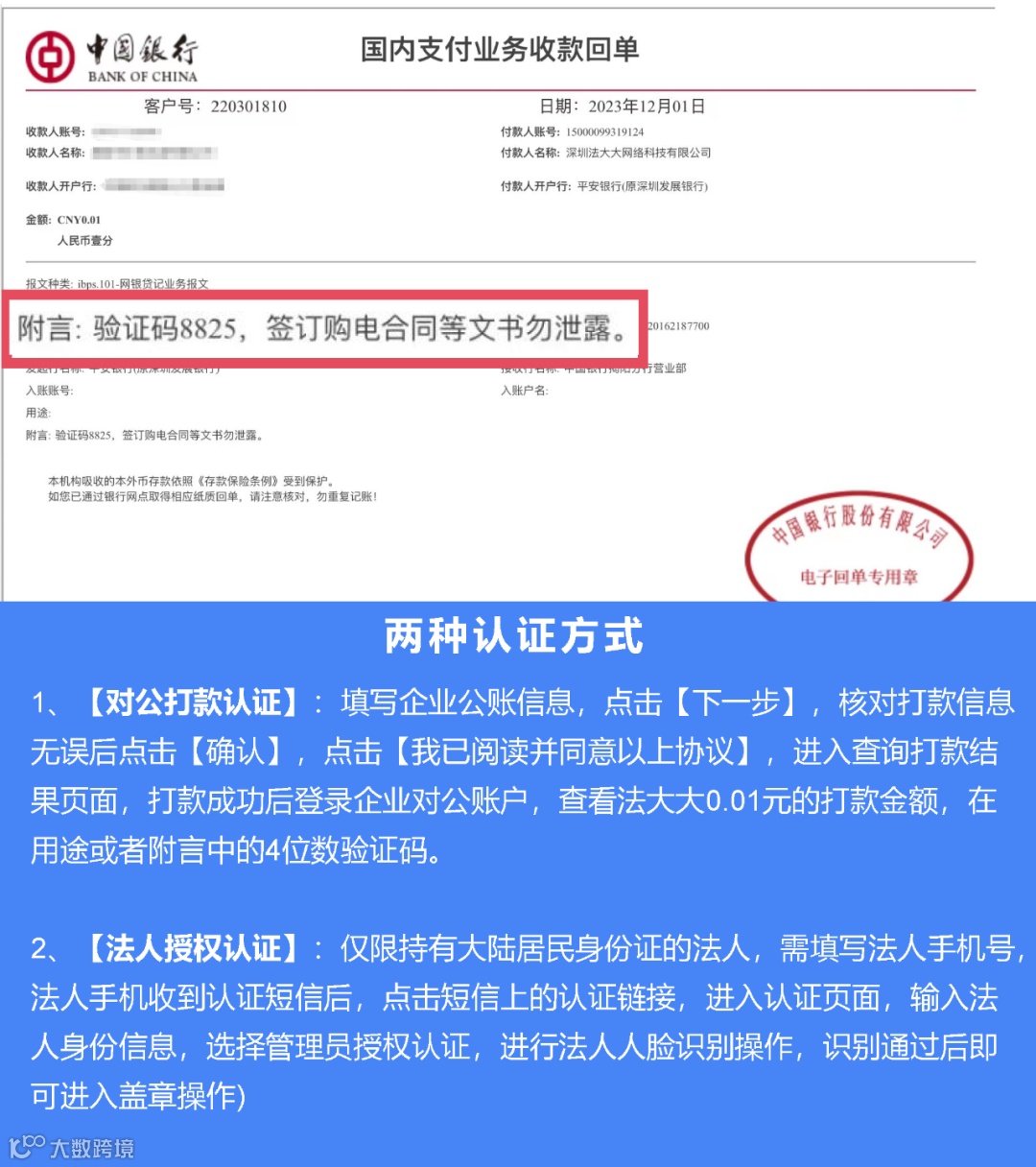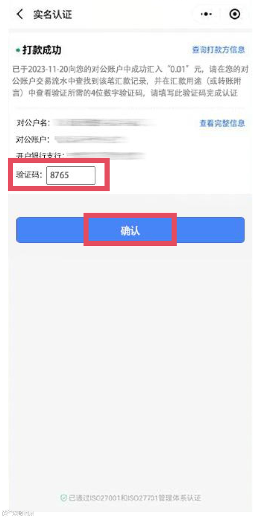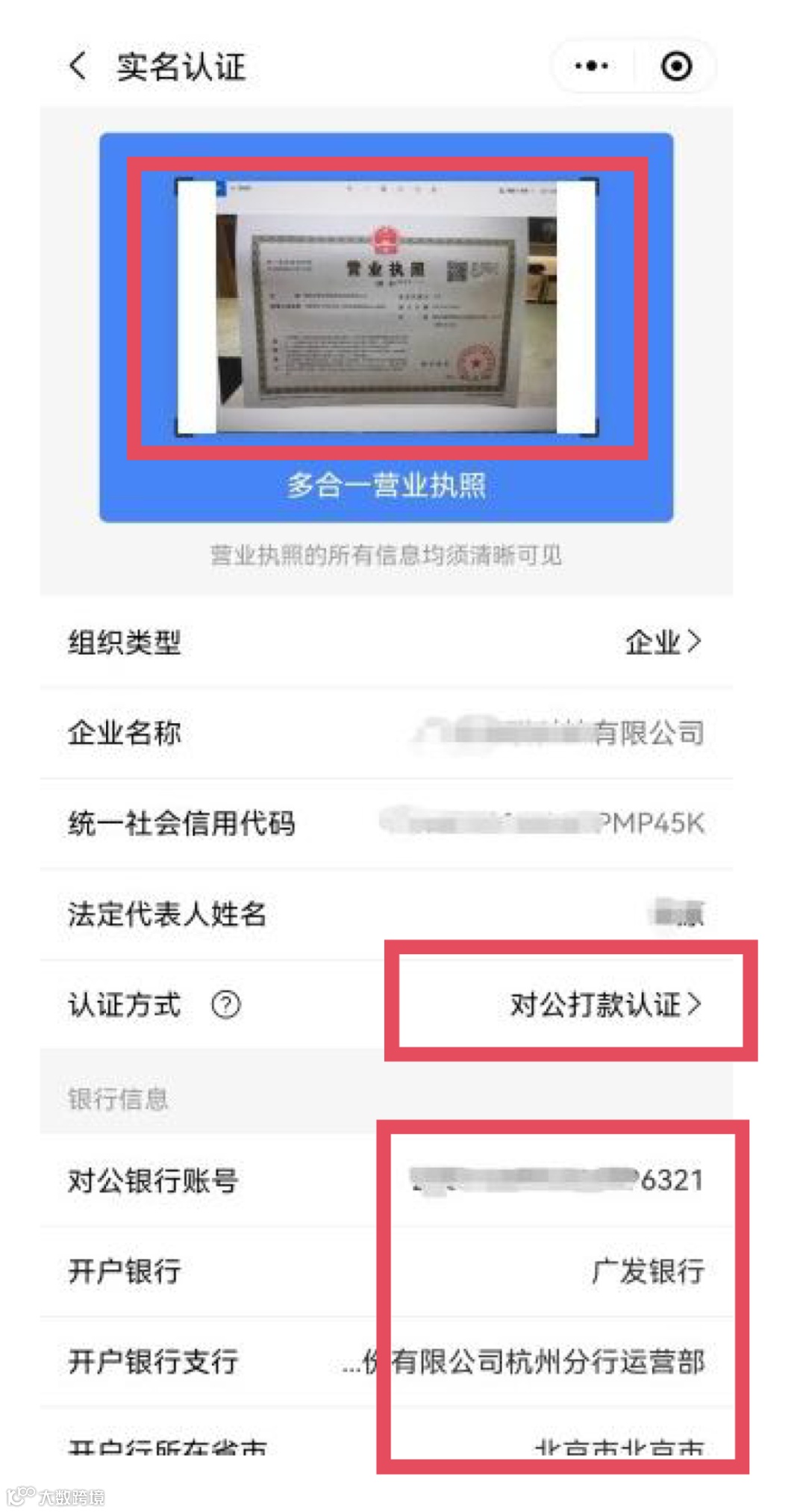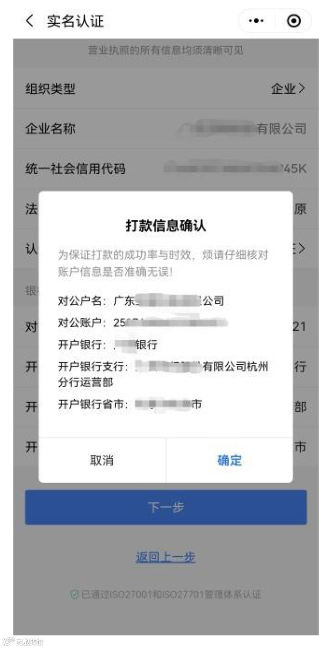 上传企业营业执照,认证方式选择【对公打款认证】,填写企业公账信息,点击【下一步】