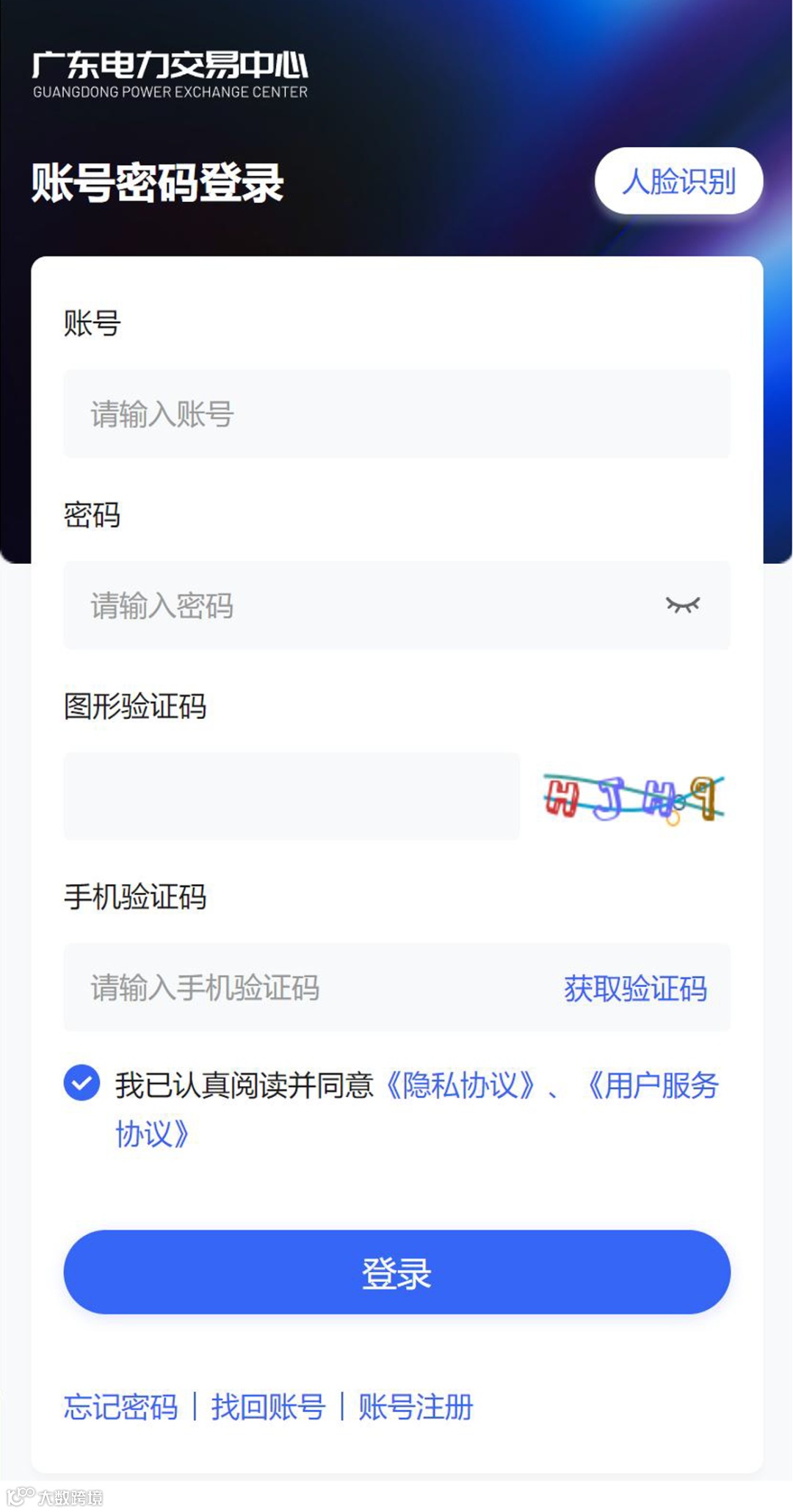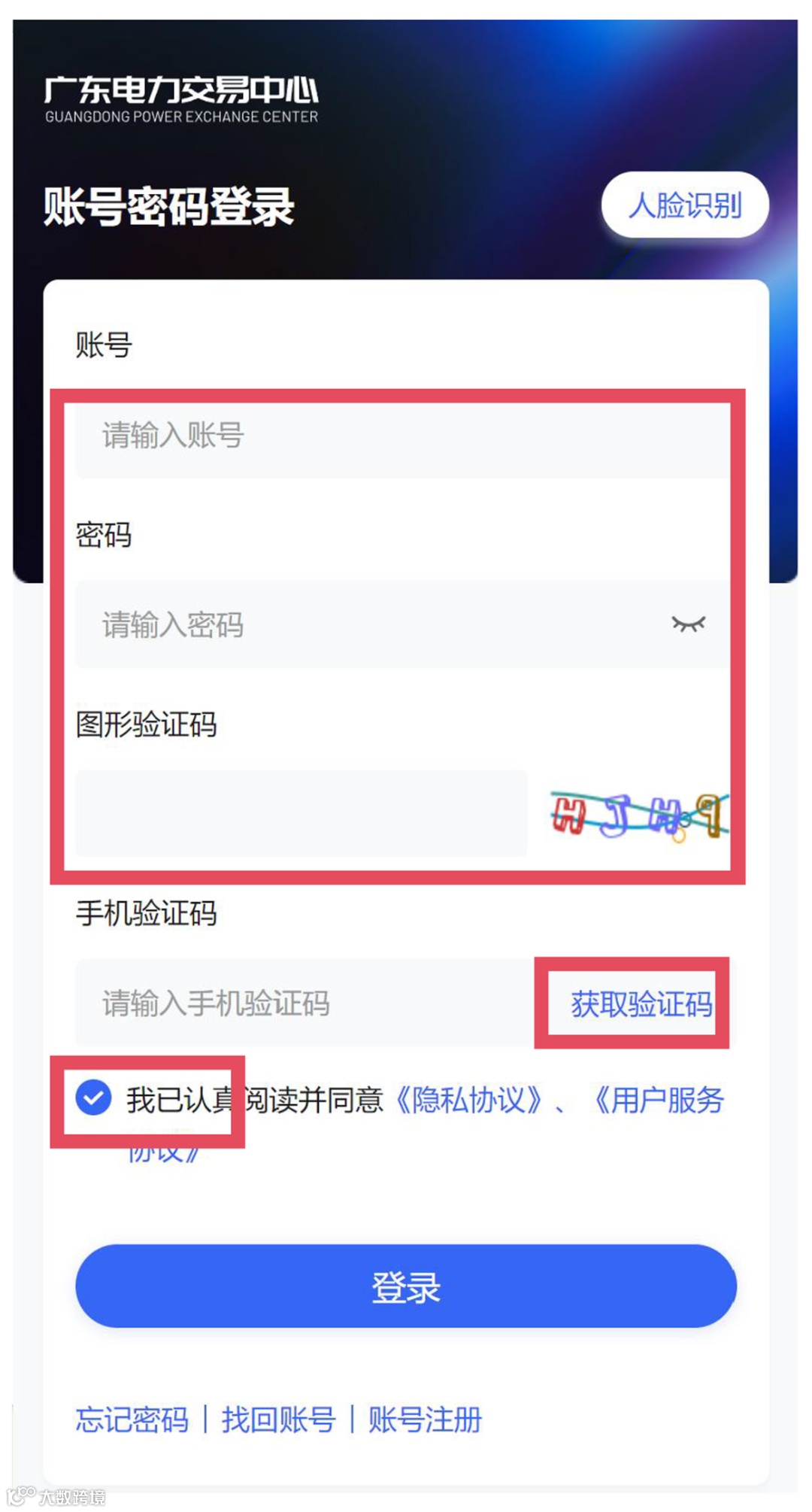 输入账号、密码、图形验证码、手机验证码,勾选上“我已认真阅读并同意《隐私协议》、《用户服务协议》”