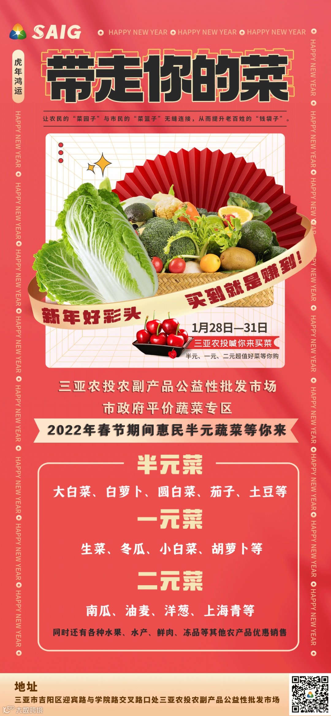 此次2022年春节惠民蔬菜行动,是进一步做好春节期间保供稳价工作的又一举措,实现提升市民幸福感和获得感,让市民“菜篮子”拎得舒心、放心。春节期间,三亚农投集团将加大对三亚农投集团农产品公益性批发市场“平价菜”的投放,扎实做好批发市场供应、防控等工作的同时,确保“菜篮子”市场供应和价格稳定有序,全力保障市民蔬菜供应不脱销、不停供,并严格执行蔬菜质量安全规定,切实守好节日期间市民的“菜篮子”与舌尖上的安全。