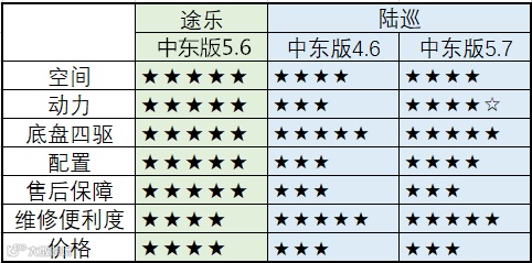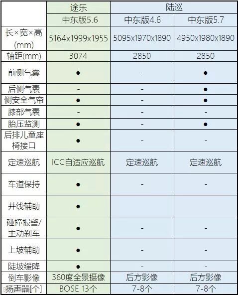 以上罗列的配置对比并不全面,由于中东版车型基本都是定制的,没有固定配置,所以无法准确对比车型之间的配置差异。不过通过粗略地对比还是能看出途乐的配置优势。
