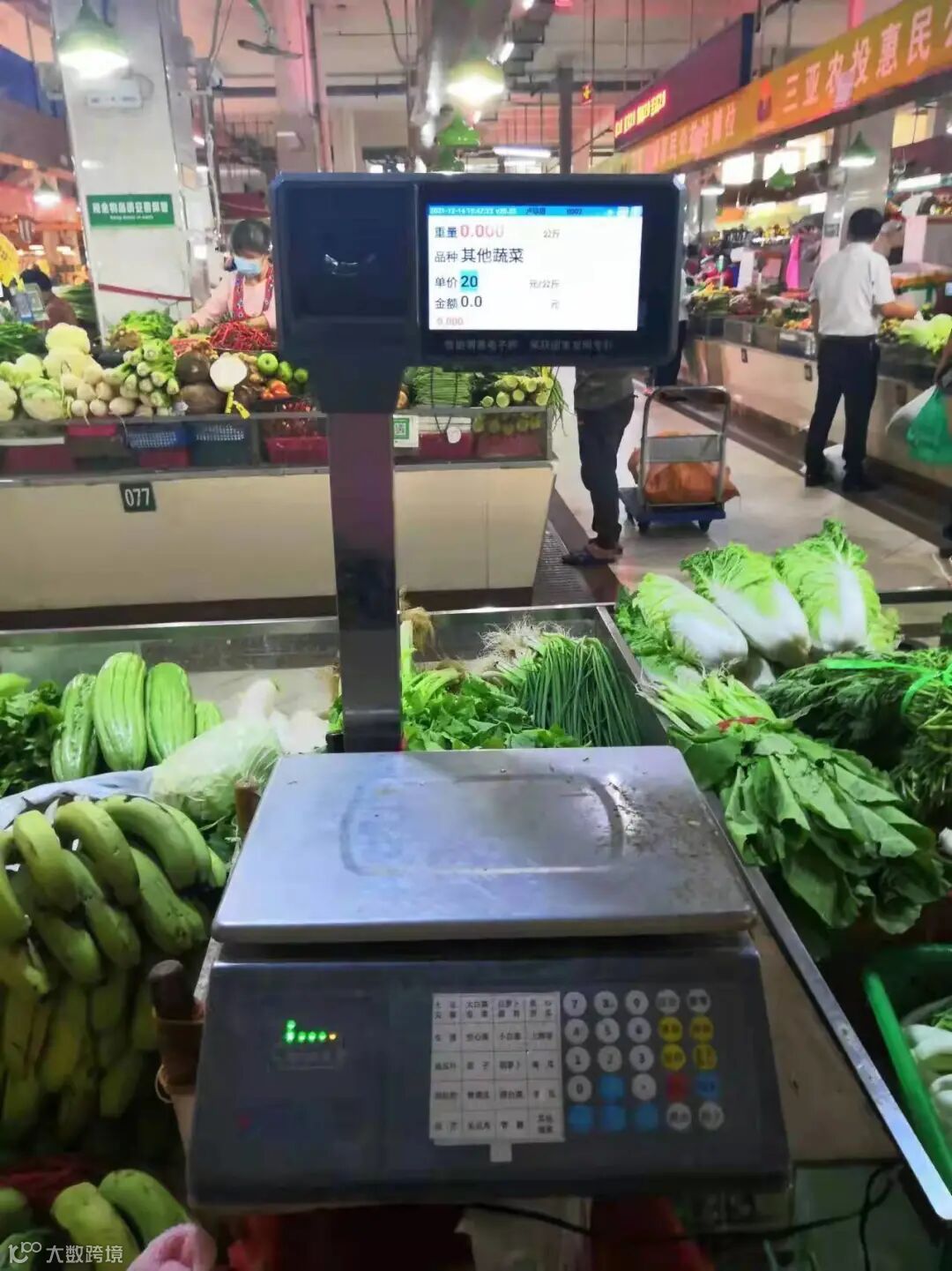 一位顾客的蔬菜被放上了电子秤称重计价,伴随着几下清脆的电子按键音,一串信息显示在了与秤连接的电子屏上。
