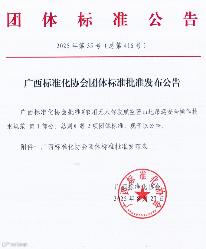 经广西标准化协会审查批准,《农用无人驾驶航空器山地吊运安全操作技术规范 第1部分:总则》(T/GXAS 788—2025)和 《农用无人驾驶航空器山地吊运安全操作技术规范 第2部分:果蔬类吊运》(T/GXAS 789—2025)两项团体标准正式发布,并定于2025年9月2日起正式实施。