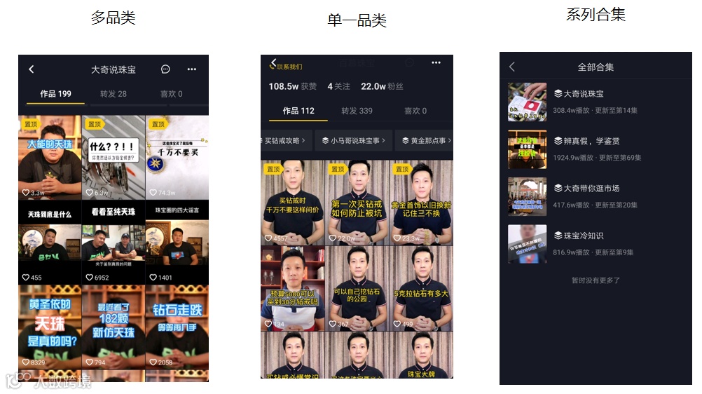 从内容定位上来看,抖音上的珠宝类账号有立足珠宝大方向的多品类账号,也有针对单一品类如钻石的高集中度账号,两类账号都可以在内容基础上打造系列合集,增加每个视频之间的关联度。