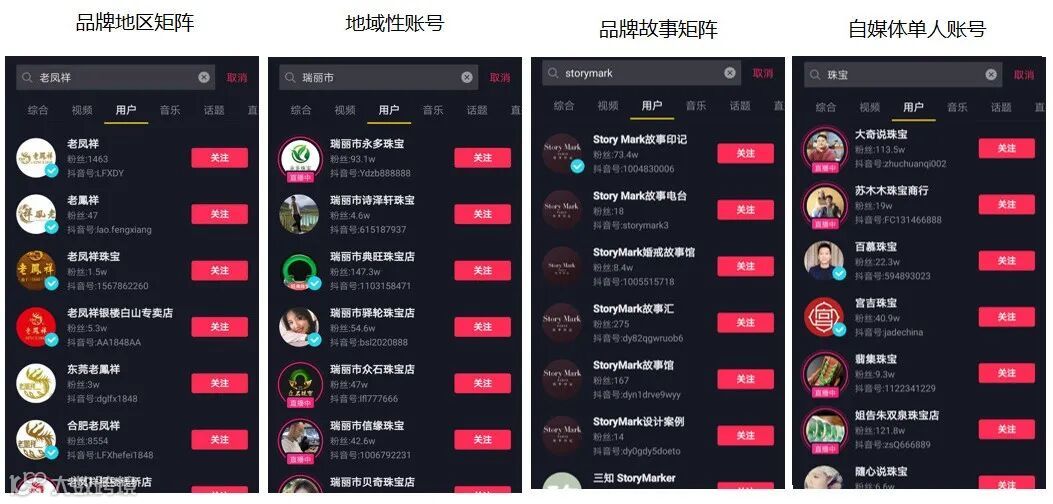 第一类:品牌地区矩阵,适合像老凤祥这样的知名品牌。这类品牌往往在全国各地均有相应分店,在抖音上,品牌也有着类似的账号矩阵,由分店自主运营,但是账号之间的关联性并不强,容易出现地方账号粉丝数及活跃度高于总店的情形。