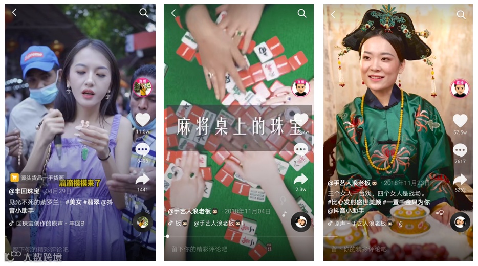 就如上文所说,云南瑞丽市是珠宝玉石原产地,也衍生出了短视频平台特有的珠宝交易景象,这里涌现了一大批定位中缅边境的账号,这些账号视频往往是一位打扮靓丽的美女鉴别师,拿着玉石灯,来到缅甸收货,被一群拿着满手货的货主围在中央,一一鉴别货主拿来的货品,然后,就是一轮轮你来我往的砍价过程,报价上千的玉石往往会被一口价还到几十甚至几块的价格,新鲜感十足。