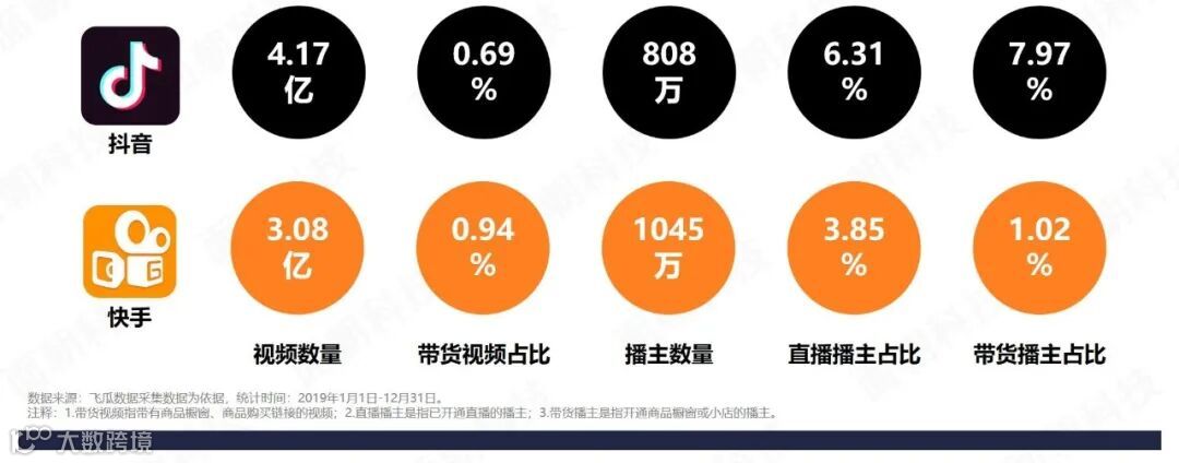 抖音日活突破4亿,2019年带货视频占比0.69%,带货播主占比为7.9%;快手突破2亿,2019年带货视频占比0.94%,带货播主占比为1.02%。