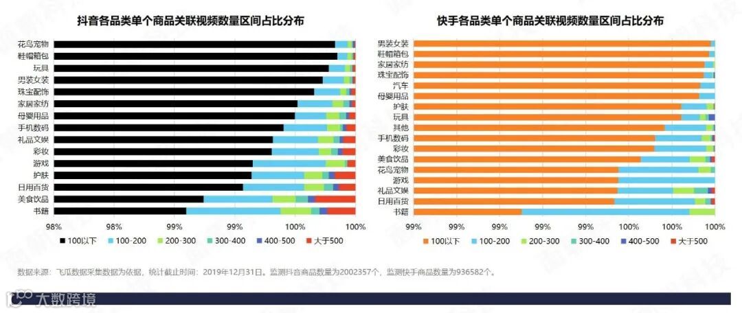 数据显示,2019年各品类单个商品关联视频数量基本都处于100以下。抖音平台单个商品关联视频数量大于500的品类数量较多,且比例高于快手平台,其中美食饮品、书籍、护肤、日用百货、彩妆品类占比较高。