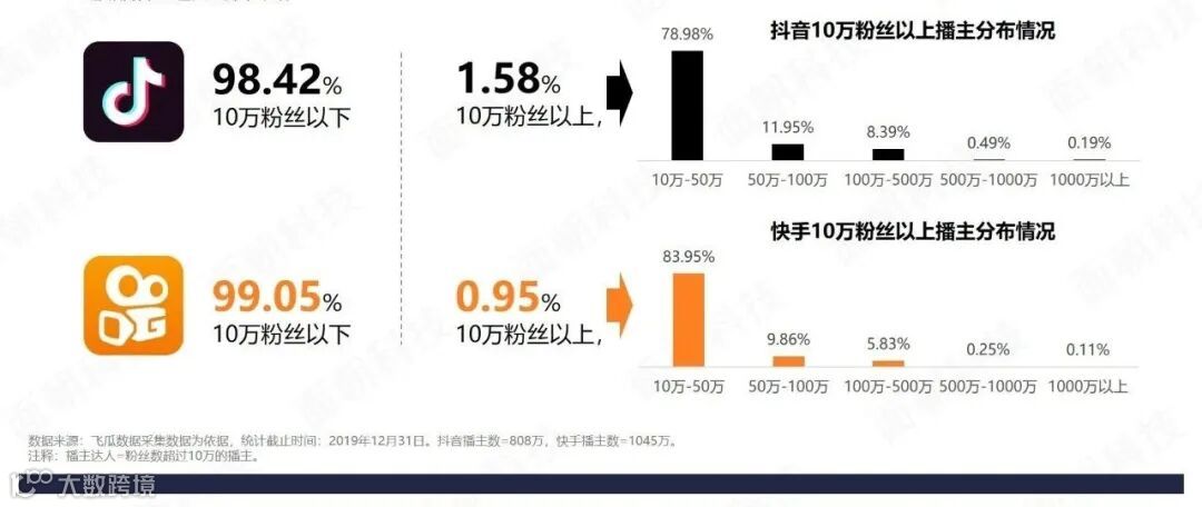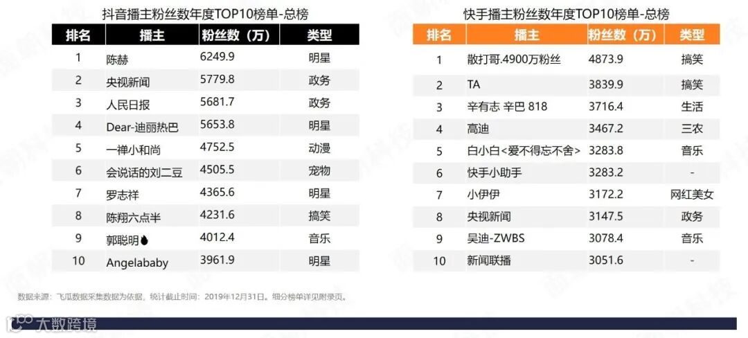 抖音粉丝数最多的播主为明星、MCN机构旗下达人;快手粉丝数最多的播主为民间、UGC属性达人。