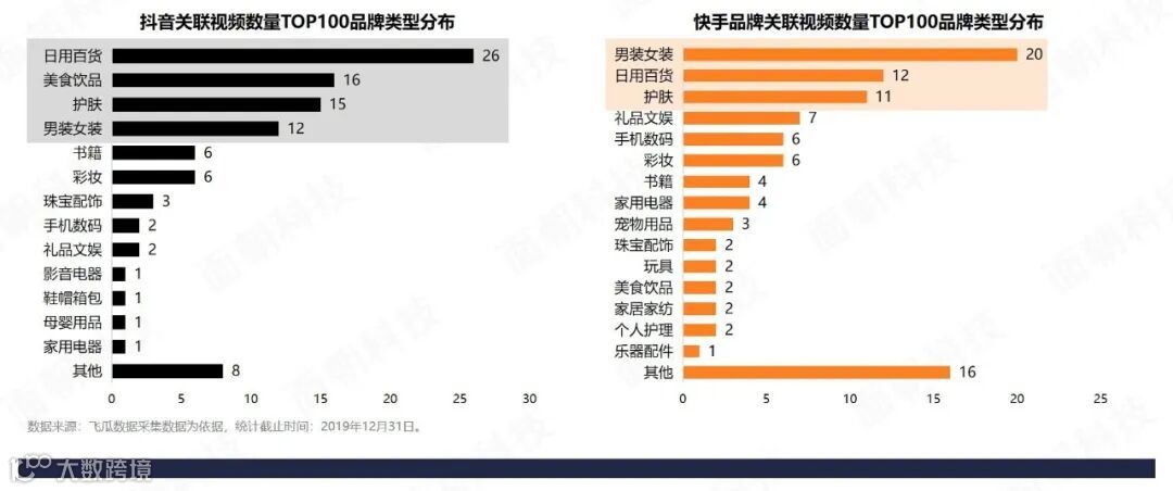 2019年关联视频数量TOP100的品牌类型分布中,抖音日用百货、美食饮品、护肤、男装女装类型品牌占比较大,快手男装女装、日用百货、护肤类型品牌占比较大。